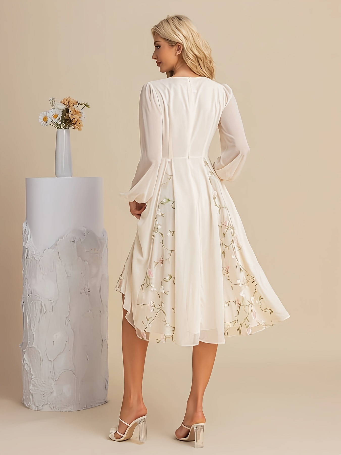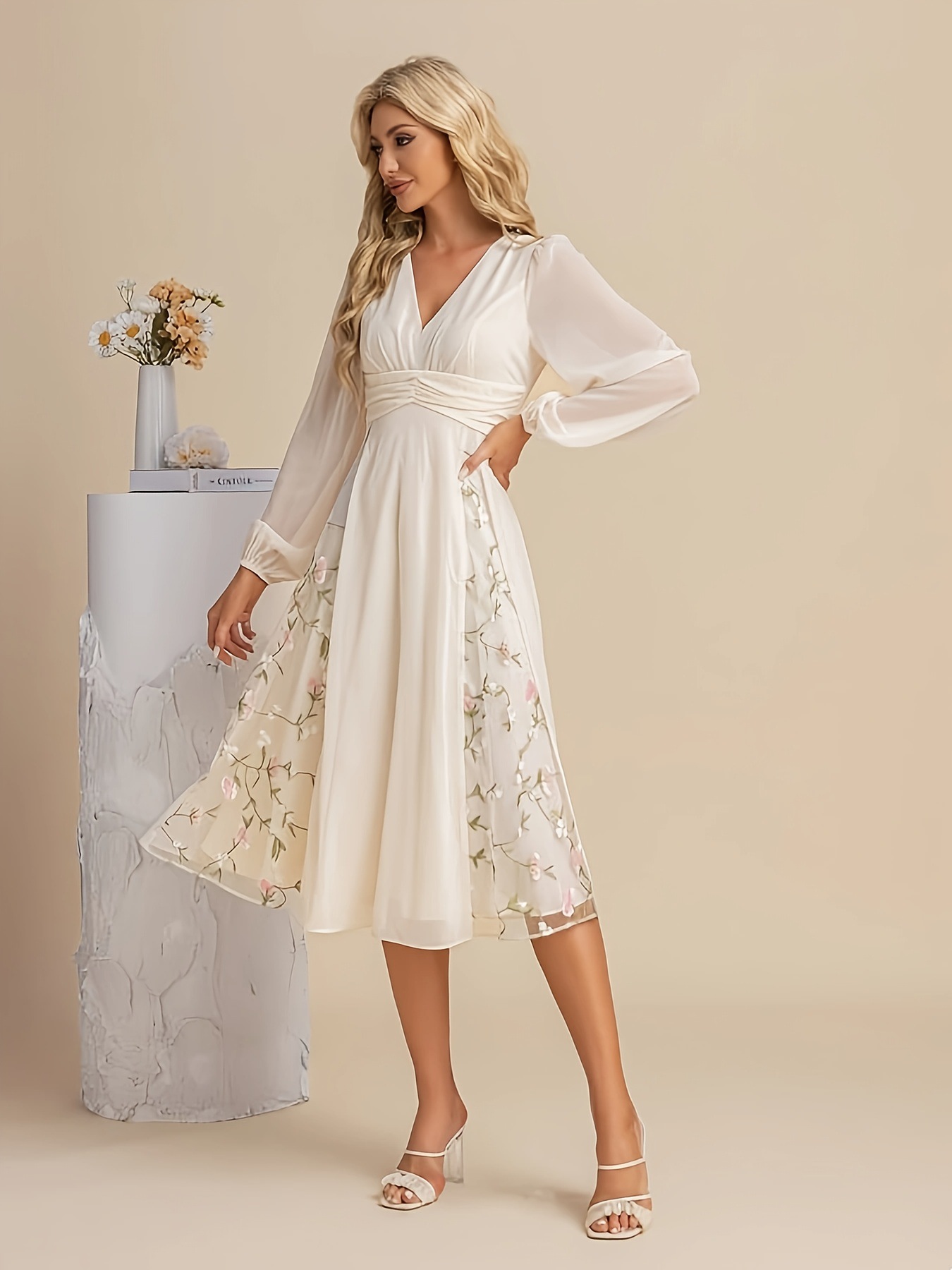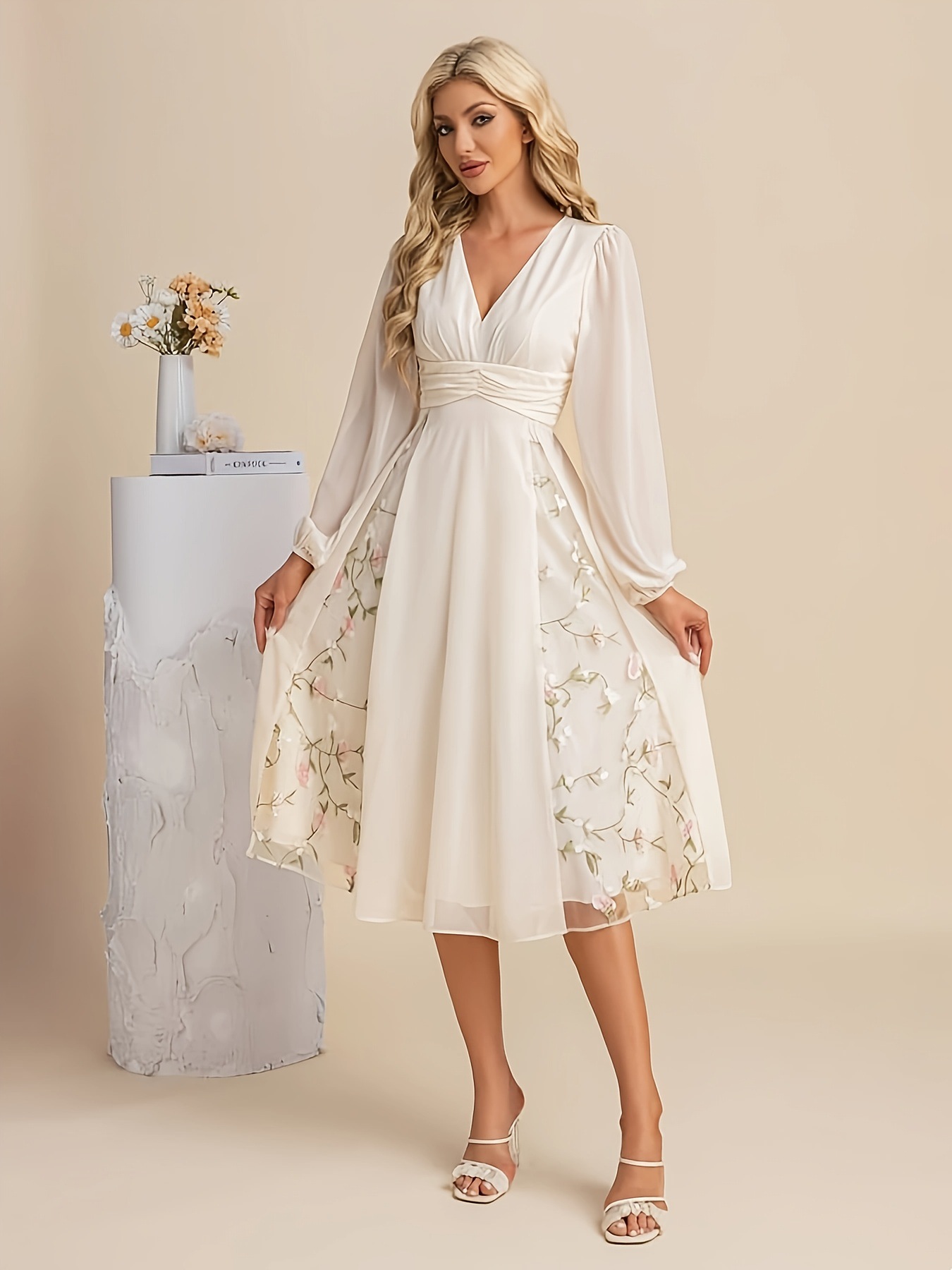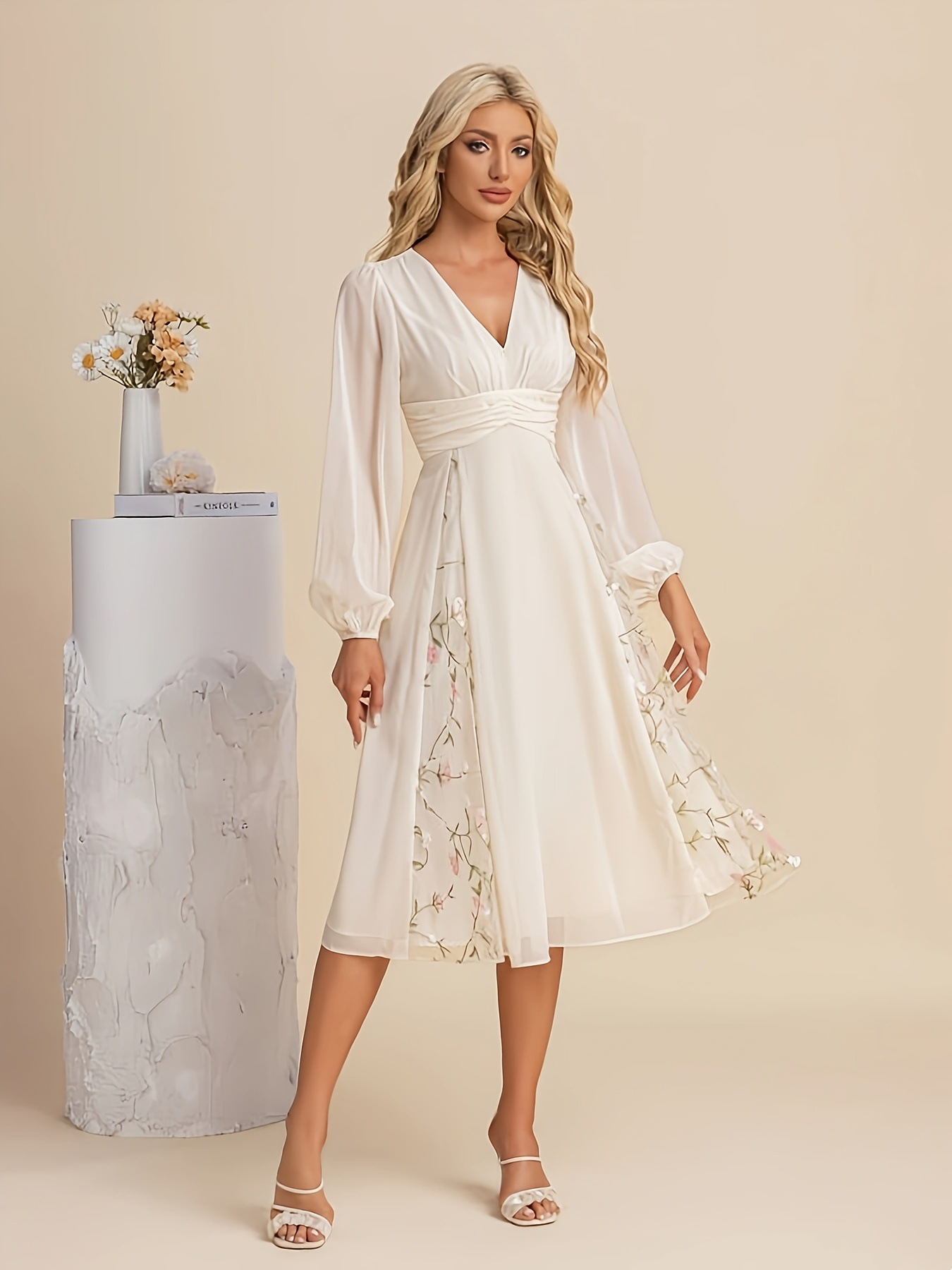 Floral Long-Sleeve V-Neck Pleated Dress For Women